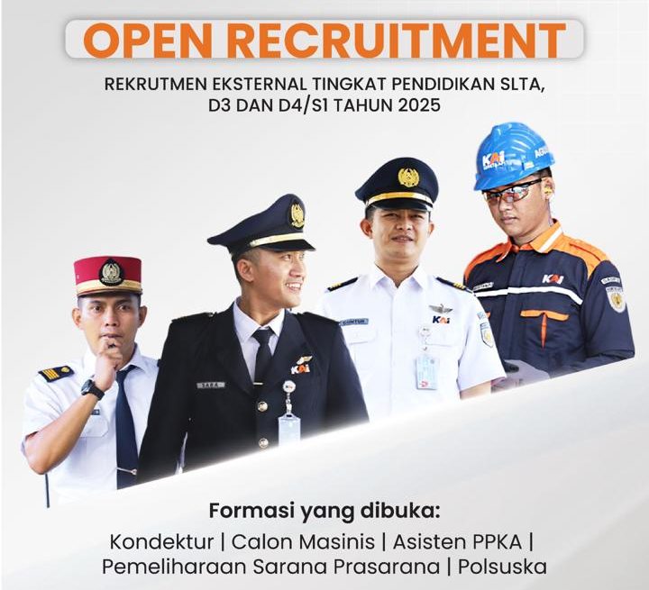 Pendaftaran dibuka mulai 30 Agustus hingga 1 September 2025 melalui laman resmi https://e-recruitment.kai.id. Seluruh proses seleksi dilaksanakan di masing-masing Daerah Operasi/Divisi Regional dengan pengawasan ketat untuk menjamin transparansi dan integritas.