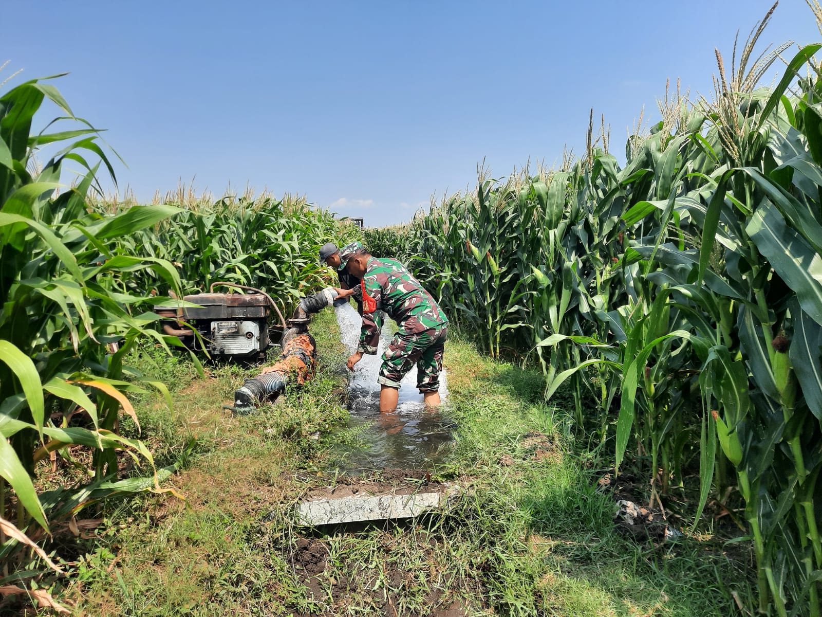 Babinsa Koramil 0810/11 Prambon Bantu Petani Irigasi Lahan Jagung di Desa Sonoageng