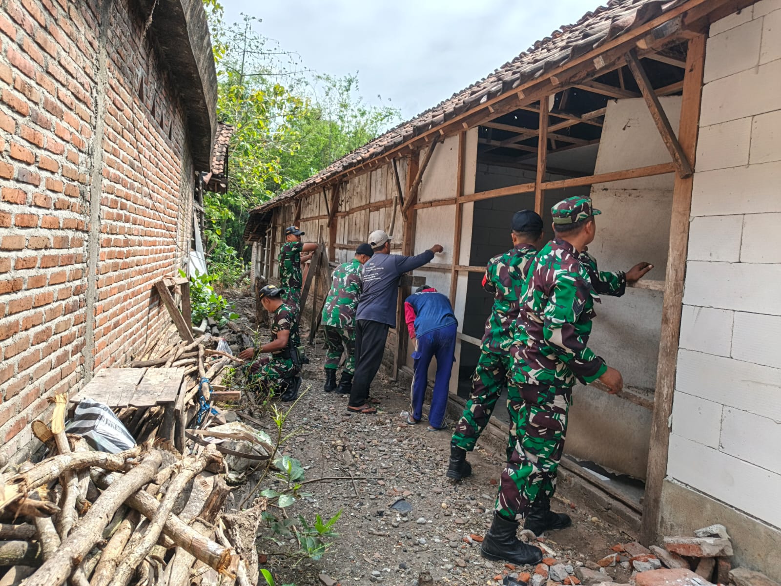 Nganjuk – Babinsa Koramil 0810/15 Rejoso Serda Gatot Riswantono bersama warga mulai melaksanakan pembongkaran rumah Pak Parmin salah satu warga binaannya yang mendapatkan bantuan program bedah rumah di Desa Sambikerep Kecamatan Rejoso Kabupaten Nganjuk. Jumat (19/09/2025)