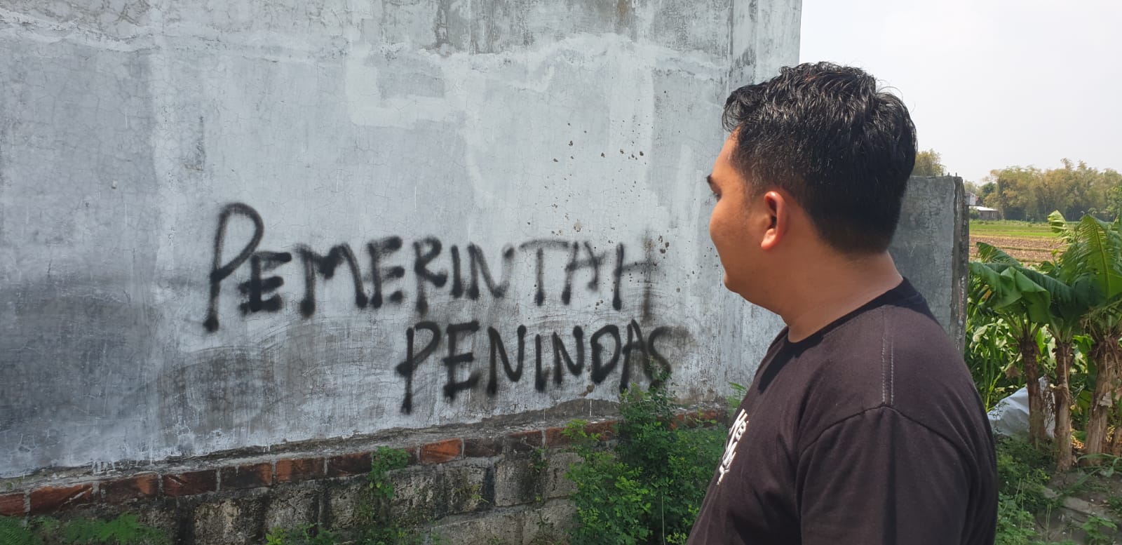 Tulisan bernada kritik keras terhadap pemerintah ditemukan di tiga titik berbeda, salah satunya di tembok balai pertemuan desa yang bertuliskan “Pemerintah Penindas” menggunakan cat berwarna hitam.