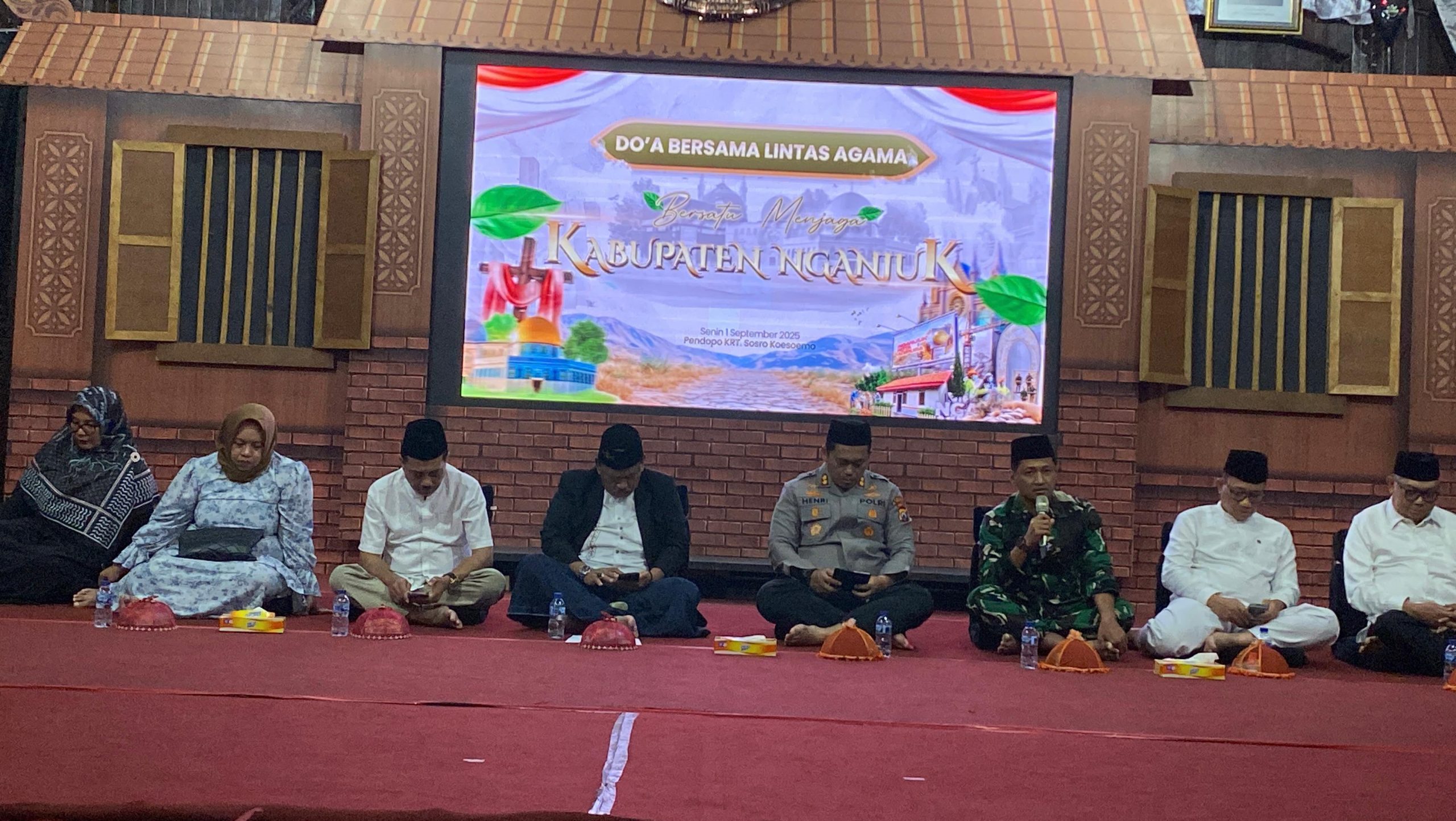 Nganjuk – Suasana penuh khidmat menyelimuti Kabupaten Nganjuk pada malam tadi, saat digelar Doa Bersama Lintas Agama yang dihadiri langsung oleh Dandim 0810/Nganjuk Letkol Arh Mohamad Taufan Yudha Bhakti, S.I.P., S.T., bersama jajaran Forkopimda Kabupaten Nganjuk. senin (01/09/25)