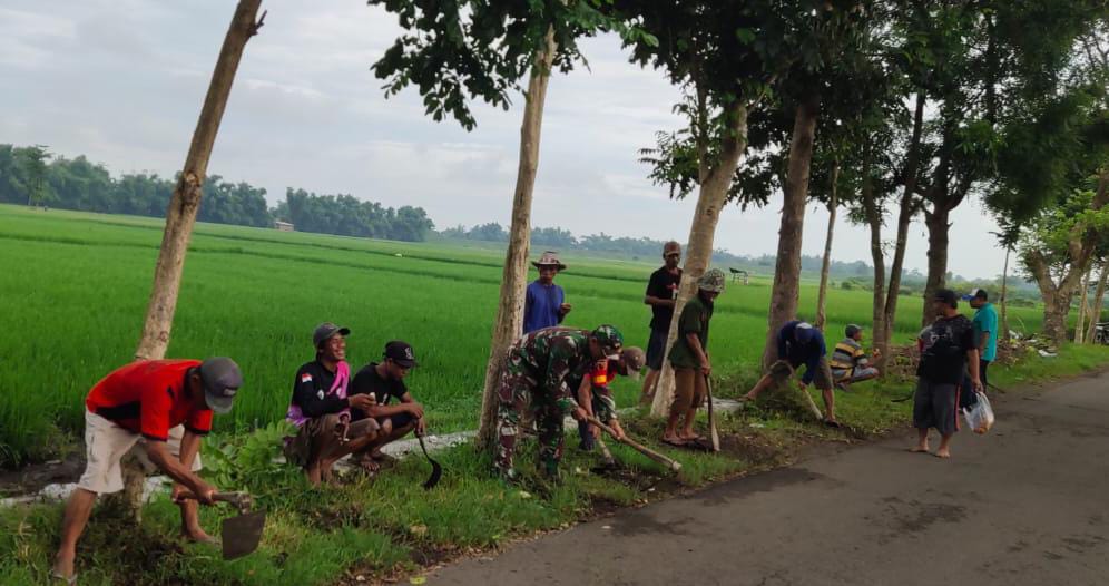 Dalam rangka kegiatan tersebut, Peltu Sumeh Kuswanto, Babinsa Desa Katerban Koramil 0810/08 Baron, melaksanakan pendekatan dan pembinaan secara langsung dengan ikut serta dalam kegiatan karya bakti pembuatan parit dan pembersihan rumput di kanan kiri jalan di wilayah Dusun Sumur Putat, Desa Katerban.