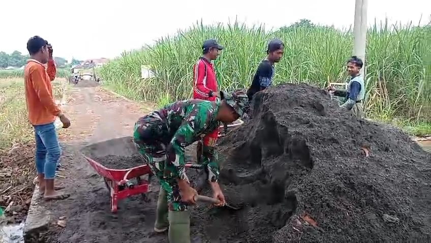 Dalam hal ini Serda Bayu Kurniawan tanpa ragu memegang alat sorong dan mengaduk campuran material bersama warga, untuk memperkeras jalan desa di wilayah binaannya, karena akses jalan tersebut sangat penting bagi pengguna jalan di desa setempat.