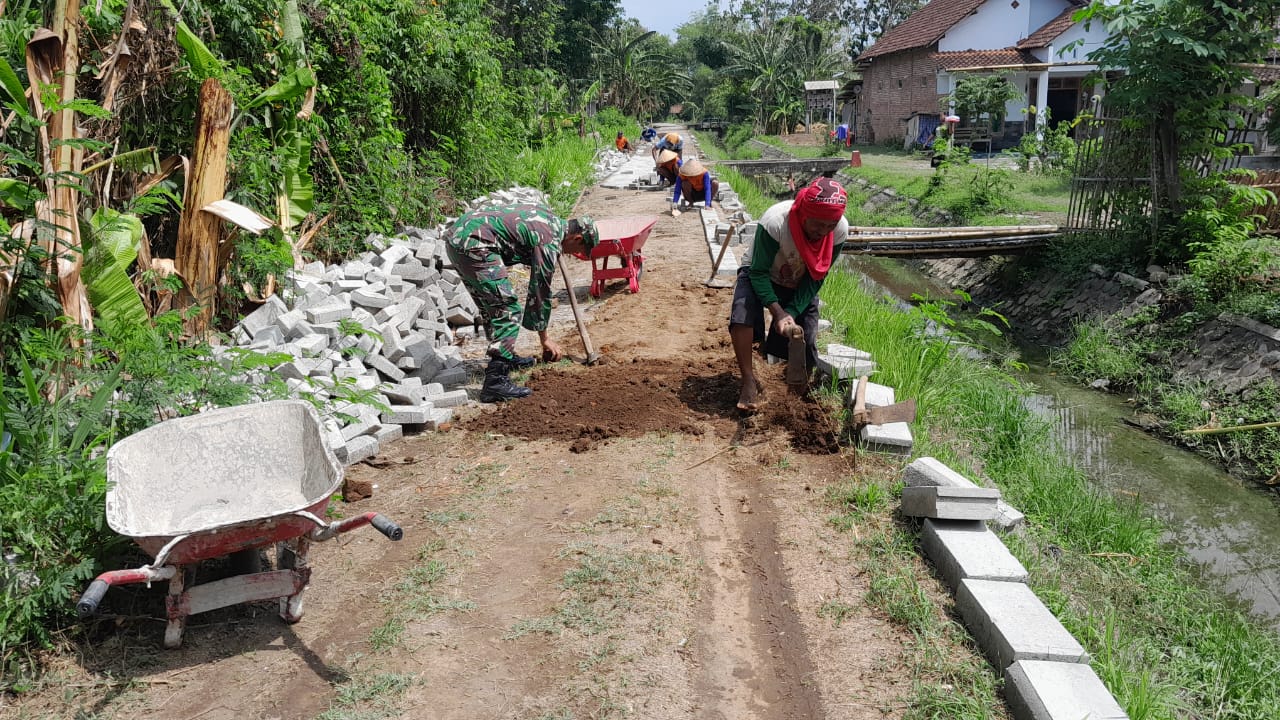 Babinsa Koramil 0810/09 Ngronggot Ajak Warga Desa Betet Gotong Royong Pasang Paving Jalan