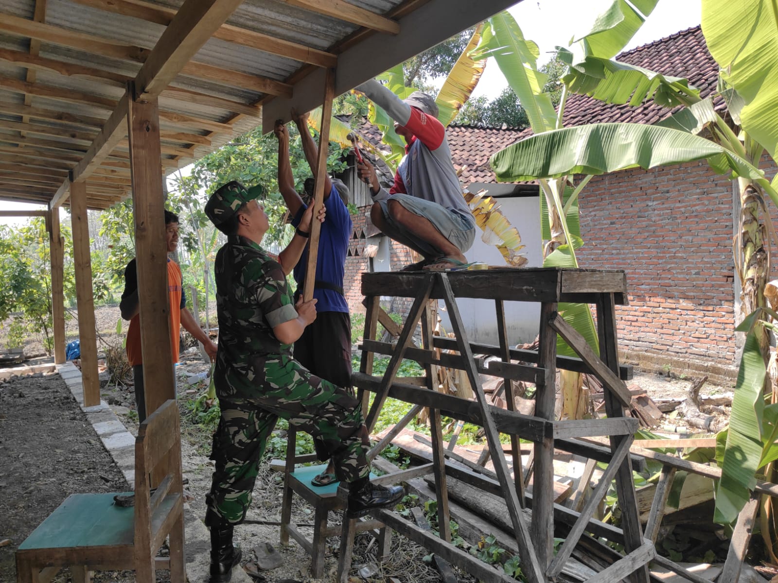Nganjuk – Babinsa Desa Lengkonglor, Serka Juhardi dari Koramil 0810/20 Ngluyu, bersama warga masyarakat melaksanakan kegiatan gotong royong membantu pembangunan rumah salah satu warga di Dusun Nggurit, Desa Lengkonglor, Kecamatan Ngluyu, Kabupaten Nganjuk.