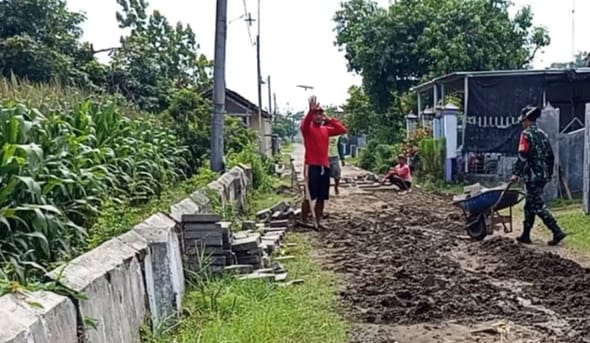 Babinsa Tanjunganom Ajak Warga Gotong Royong Perbaiki Akses Jalan Desa
