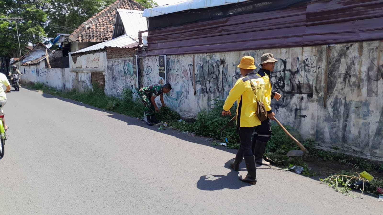 Kegiatan Kerja Bakti Pembersihan Rumput di Pinggir Jalan Menuju Pasar Baru di Kelurahan Kartoharjo Koramil 0810 / 01 Nganjuk