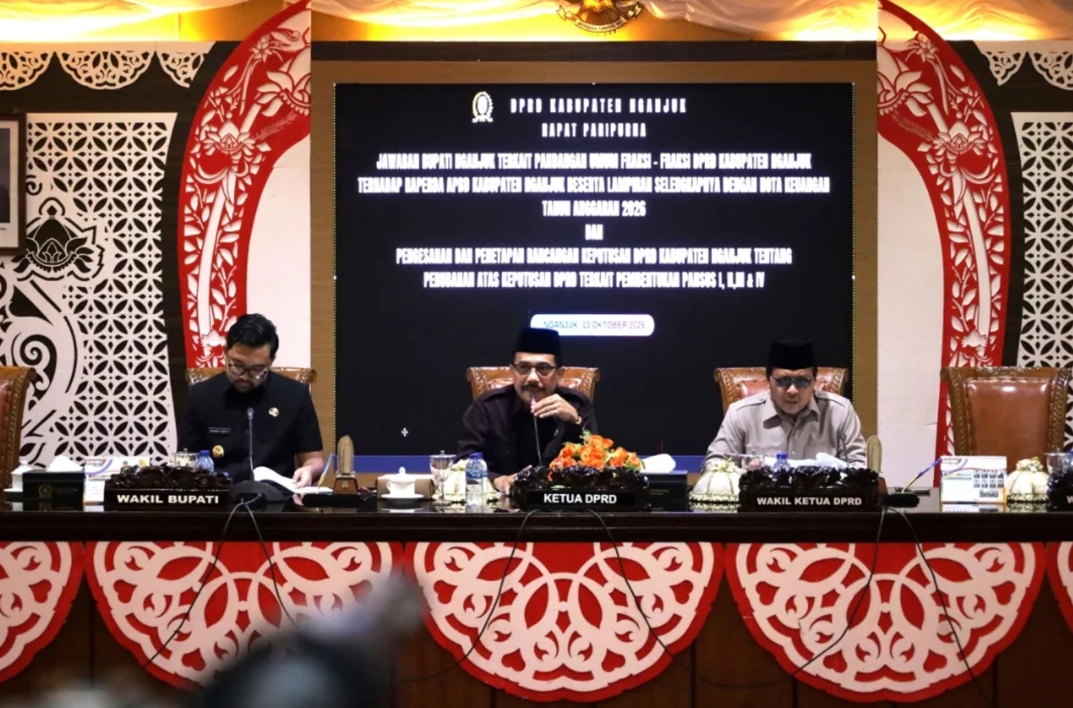 Rapat paripurna yang dipimpin langsung oleh Ketua DPRD Nganjuk, Tatit Heru Tjahjono, ini turut dihadiri oleh jajaran Forkopimda, Sekretaris Daerah, para Asisten dan Staf Ahli, serta Kepala Organisasi Perangkat Daerah (OPD) di lingkungan Pemkab Nganjuk.