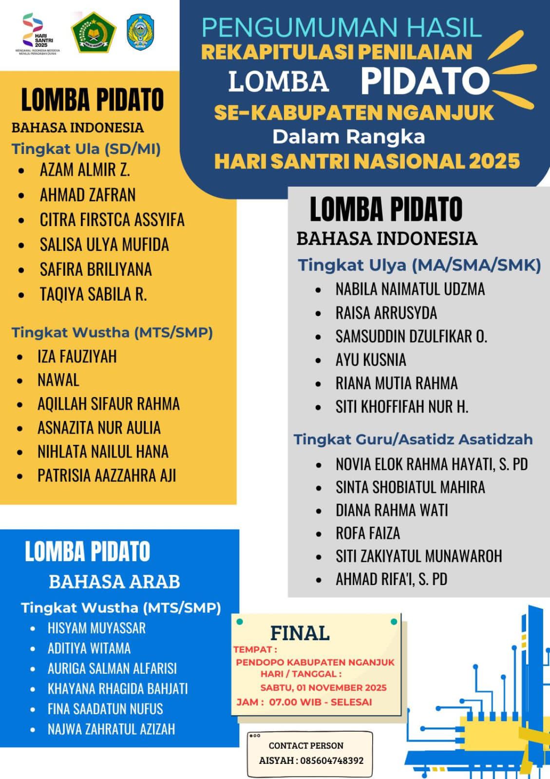 Setelah babak final ini, peserta terbaik dari setiap kategori akan diumumkan dalam Malam Tasyakuran Hari Santri Nasional 2025, yang akan dilaksanakan pada Selasa, 4 November 2025 di Kantor PCNU Kabupaten Nganjuk, Komplek Dusun Jali, Sukomoro. Acara ini juga akan dihadiri Ketua BAZNAS Provinsi Jawa Timur, H. Ali Maschan Moesa, yang merupakan mantan Ketua PWNU Jatim.
