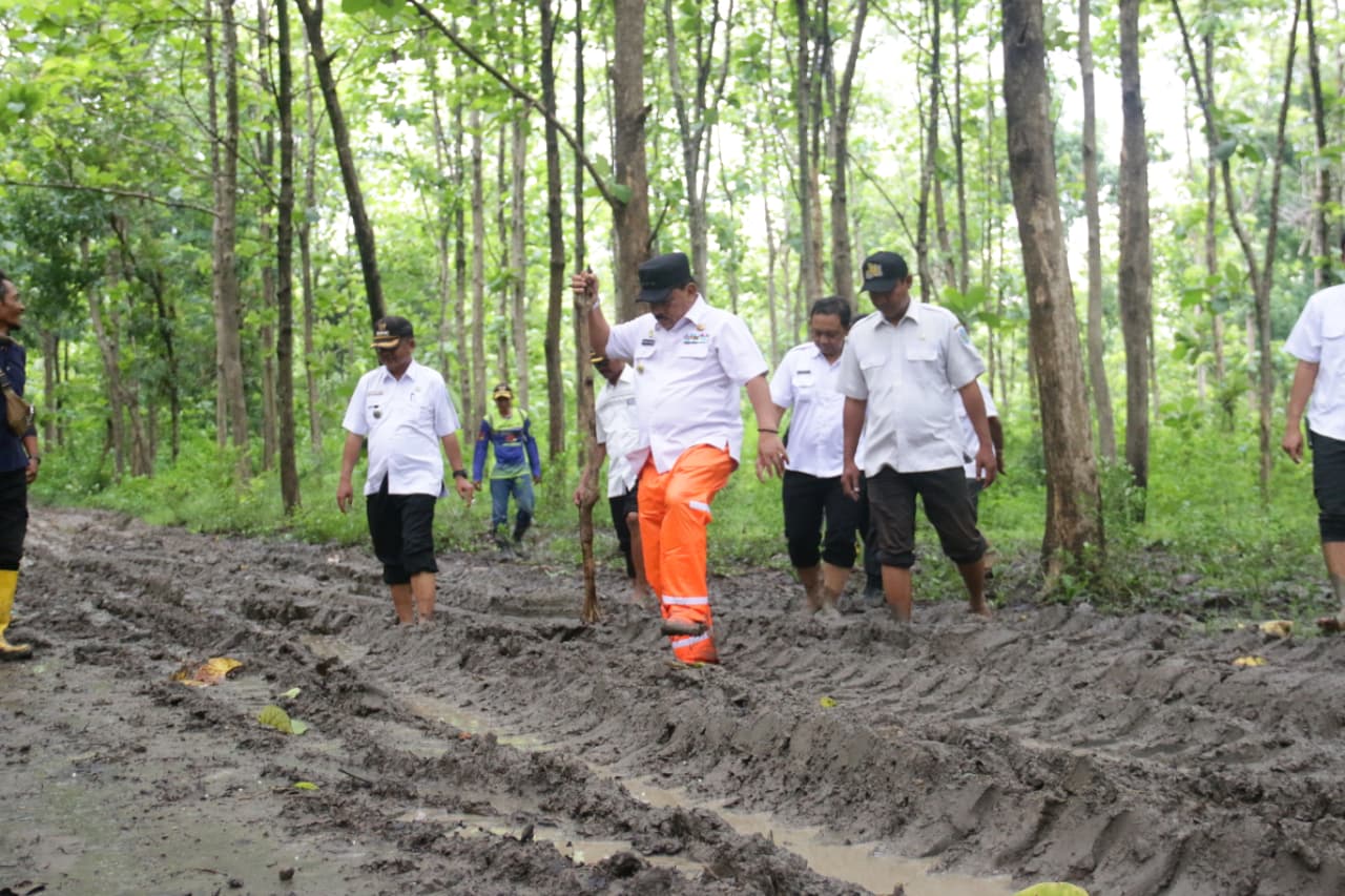 Didampingi Forkopimcam Kecamatan Jatikalen, Bupati Marhaen Djumadi langsung mencoba melintasi jalur yang rusak tersebut.