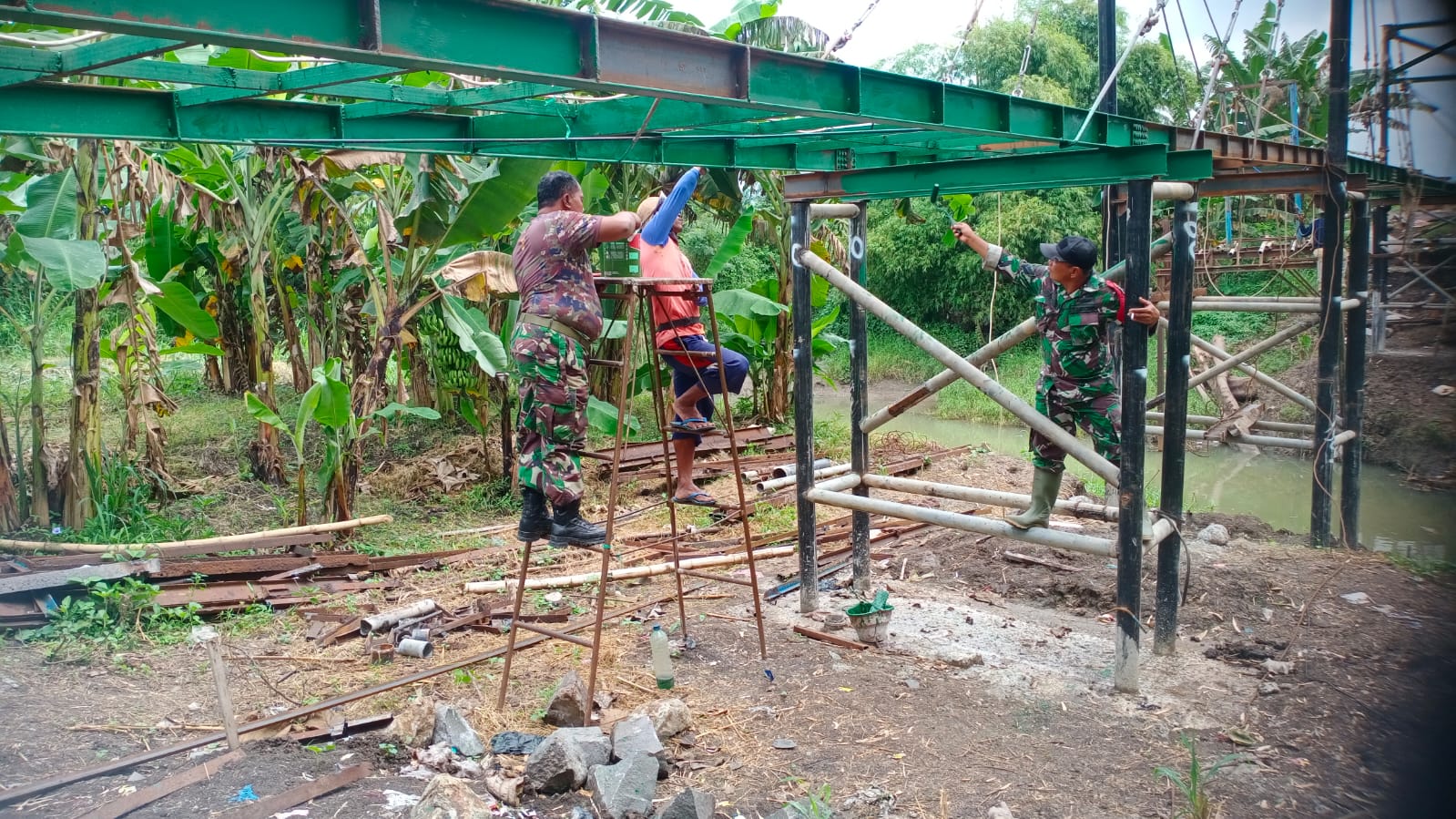 Kebersamaan antara Babinsa dan pekerja jembatan ini menjadi cerminan kuatnya sinergi TNI dengan masyarakat dalam mendukung pembangunan infrastruktur yang aman dan bermanfaat bagi warga. Tidak hanya melakukan pendampingan, Babinsa juga terlibat langsung di lapangan guna memastikan pekerjaan berjalan lancar dan sesuai rencana.