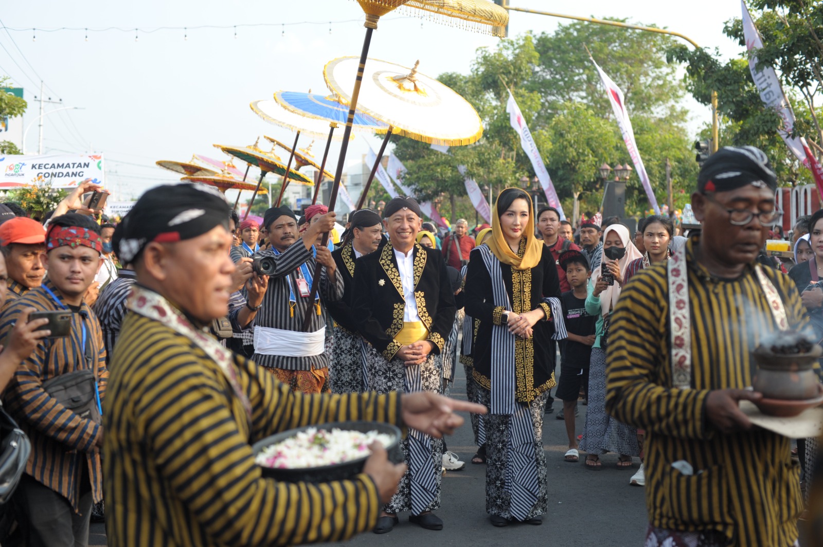 Berbusana khas Nganjuk Kaprawiran Kanigaran warna hitam, Pj Bupati Handoko didampingi istri, Eka Haryati Taruna, beserta seluruh jajaran Forkopimda Nganjuk, mengikuti prosesi Boyong Natapraja mulai dari Pendopo Alun-Alun Berbek, hingga finish di Pendopo KRT Sosro Koesomo Pemkab Nganjuk.