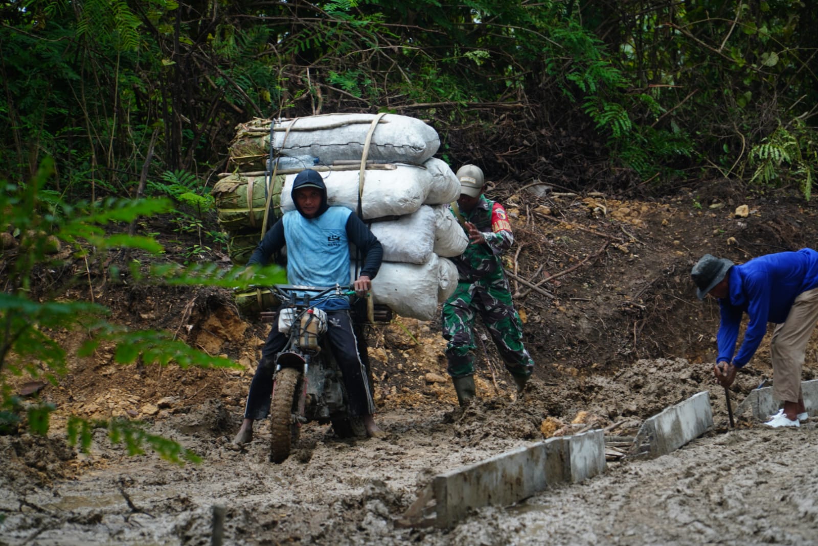 ”Terima kasih pak TNI telah membantu mendorong sepeda motor saya, akhir-akhir ini sering hujan pak, ini yang menjadi kendala saat saya mau keladang mengambil daun jati untuk dijual. Banyaknya jalan licin dan berlumpur sehingga saya kadang-kadang juga takut tapi harus bagaimana demi tuntutan kebutuhan hidup,” ucapnya.