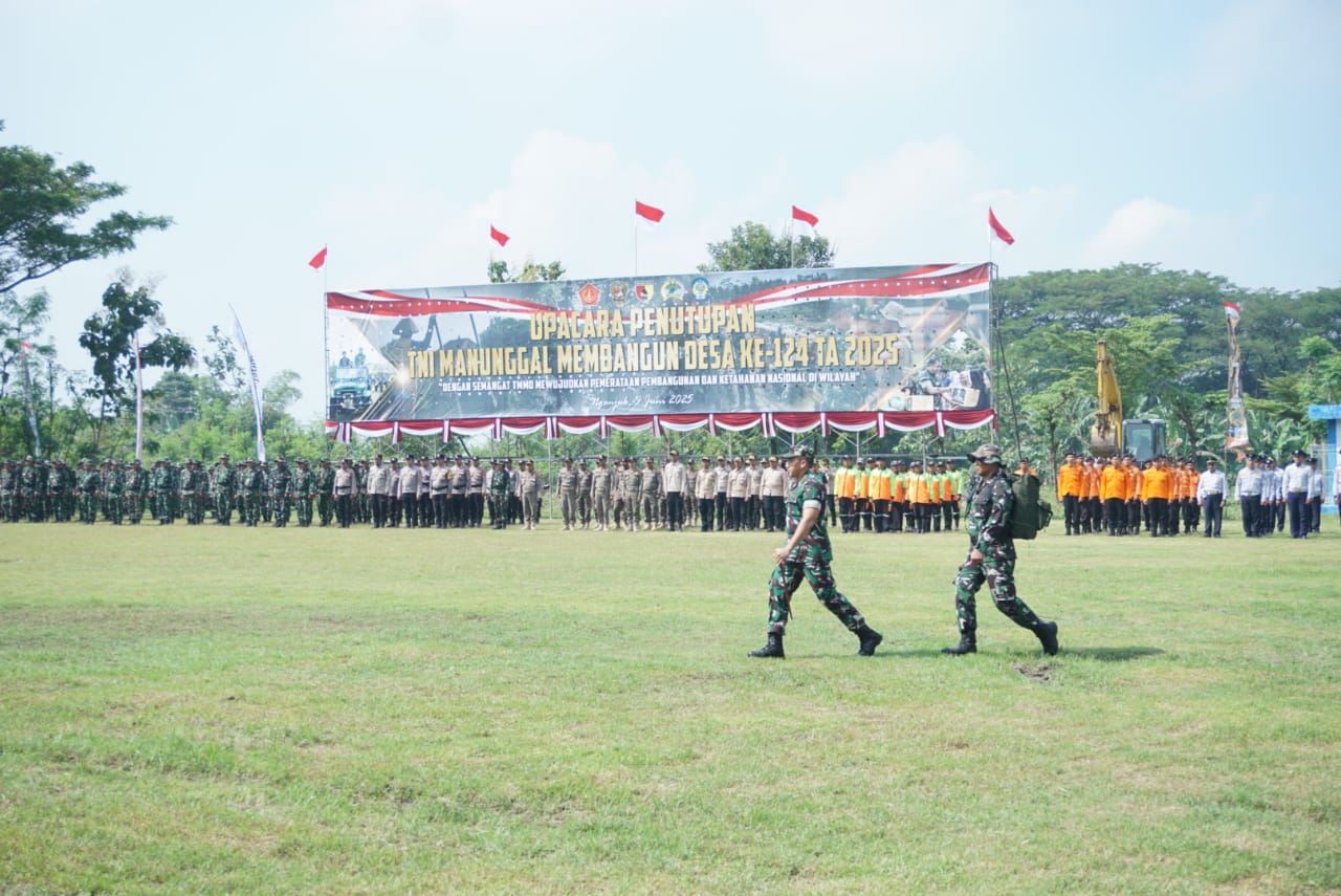 Nganjuk - TNI Manunggal Membangun Desa (TMMD) ke-124 Nganjuk resmi ditutup oleh Komandan Lanud Iswahjudi Marsekal Pertama TNI Muchtadi Anjar Legowo, M.S.,M.Han dalam upacara penutupan yang diselenggarakan di lapangan Sepak Bola Desa Lengkong kecamatan Lengkong kabupaten Nganjuk.Rabu (04/06/2025).