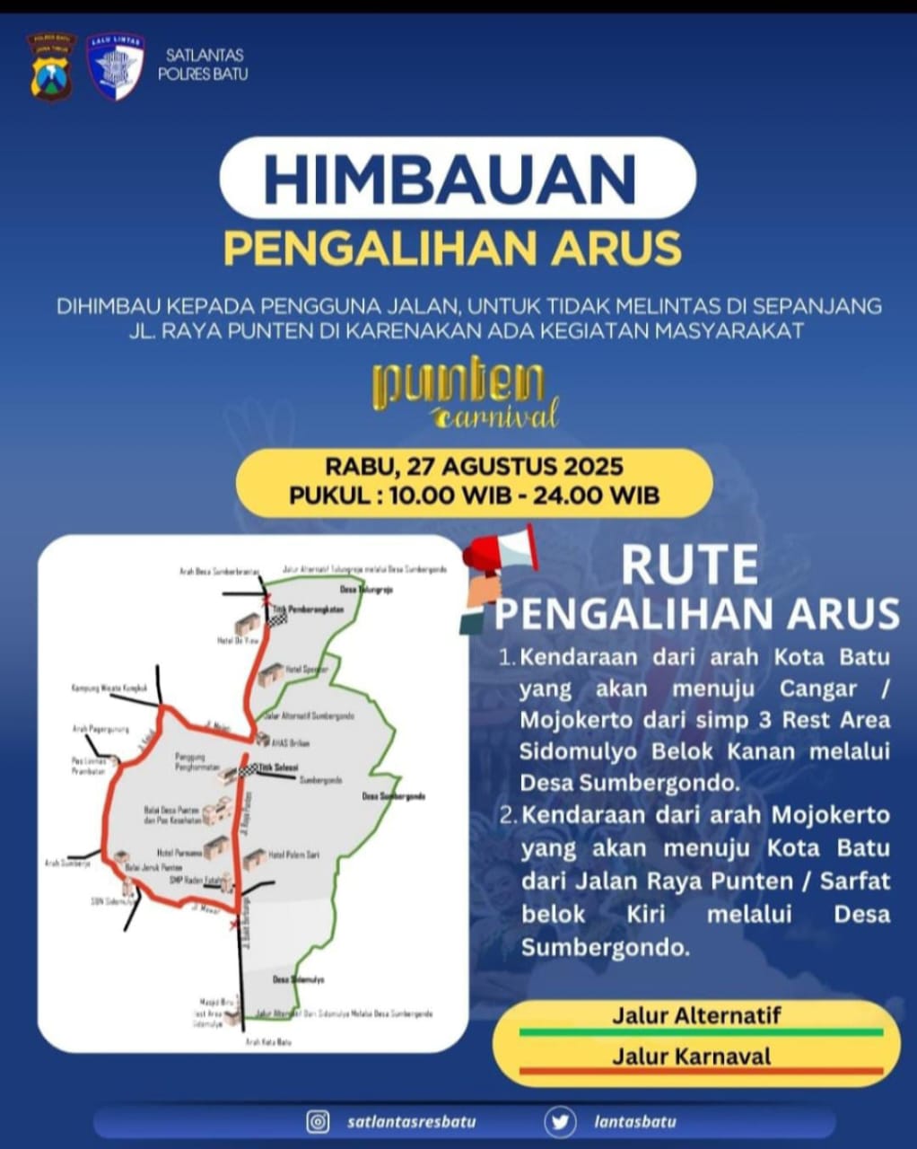 BATU, SRTV.CO.ID – Satuan Lalu Lintas (Satlantas) Polres Batu mengimbau masyarakat untuk menghindari Jalan Raya Punten pada Rabu (27/8/2025). Hal ini karena akan digelar kegiatan Punten Carnival, yang diperkirakan menarik banyak pengunjung.