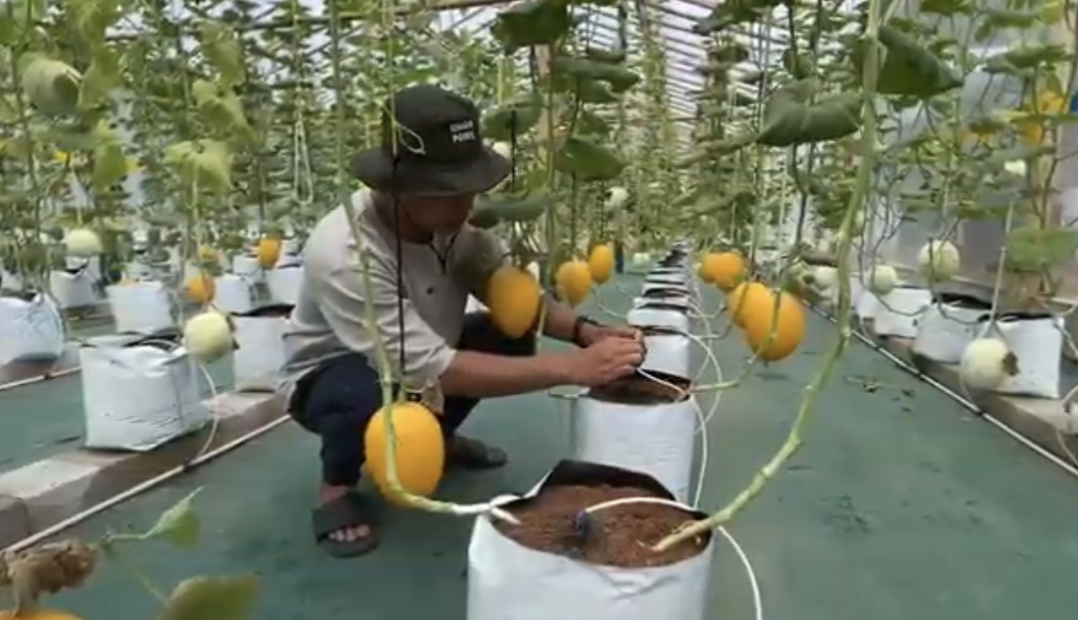 Di dalamnya, terdapat sekitar 1.000 pohon melon premium yang ditanam menggunakan media polibag dengan sistem pengairan hidroponik.