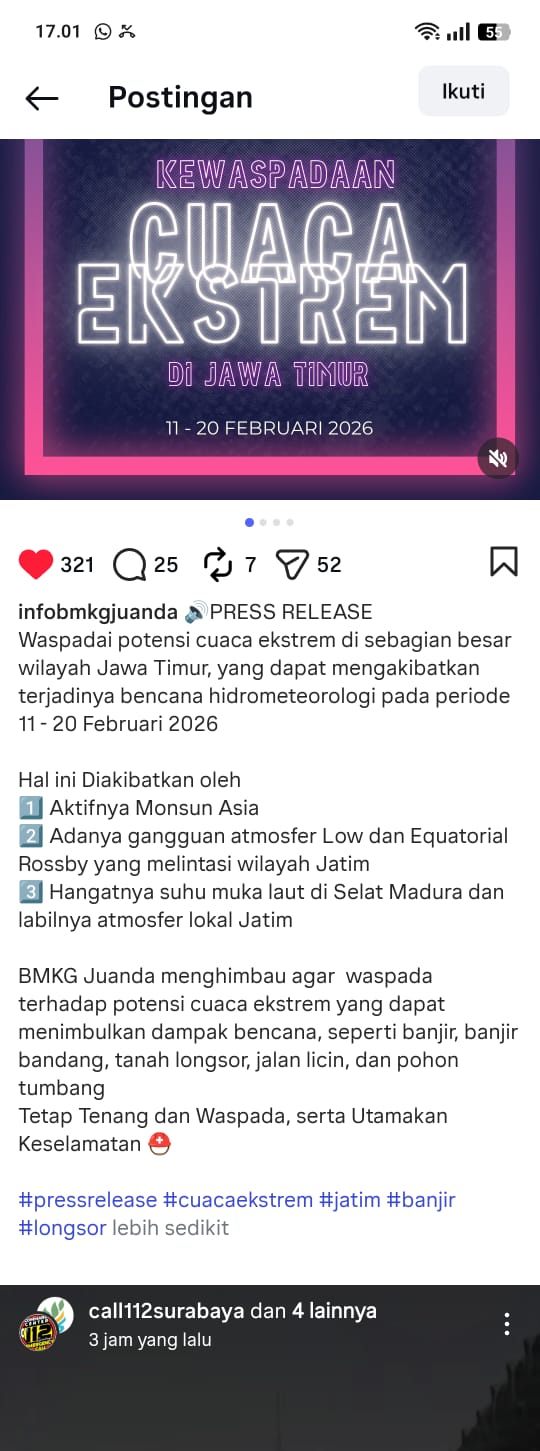 Kepala Pelaksana BPBD Kabupaten Kediri, Stefanus Joko Sukrisno, menjelaskan bahwa berdasarkan informasi BMKG, peningkatan potensi cuaca ekstrem telah mulai terjadi sejak awal Februari dan diperkirakan mencapai puncaknya pada 11–20 Februari 2026.