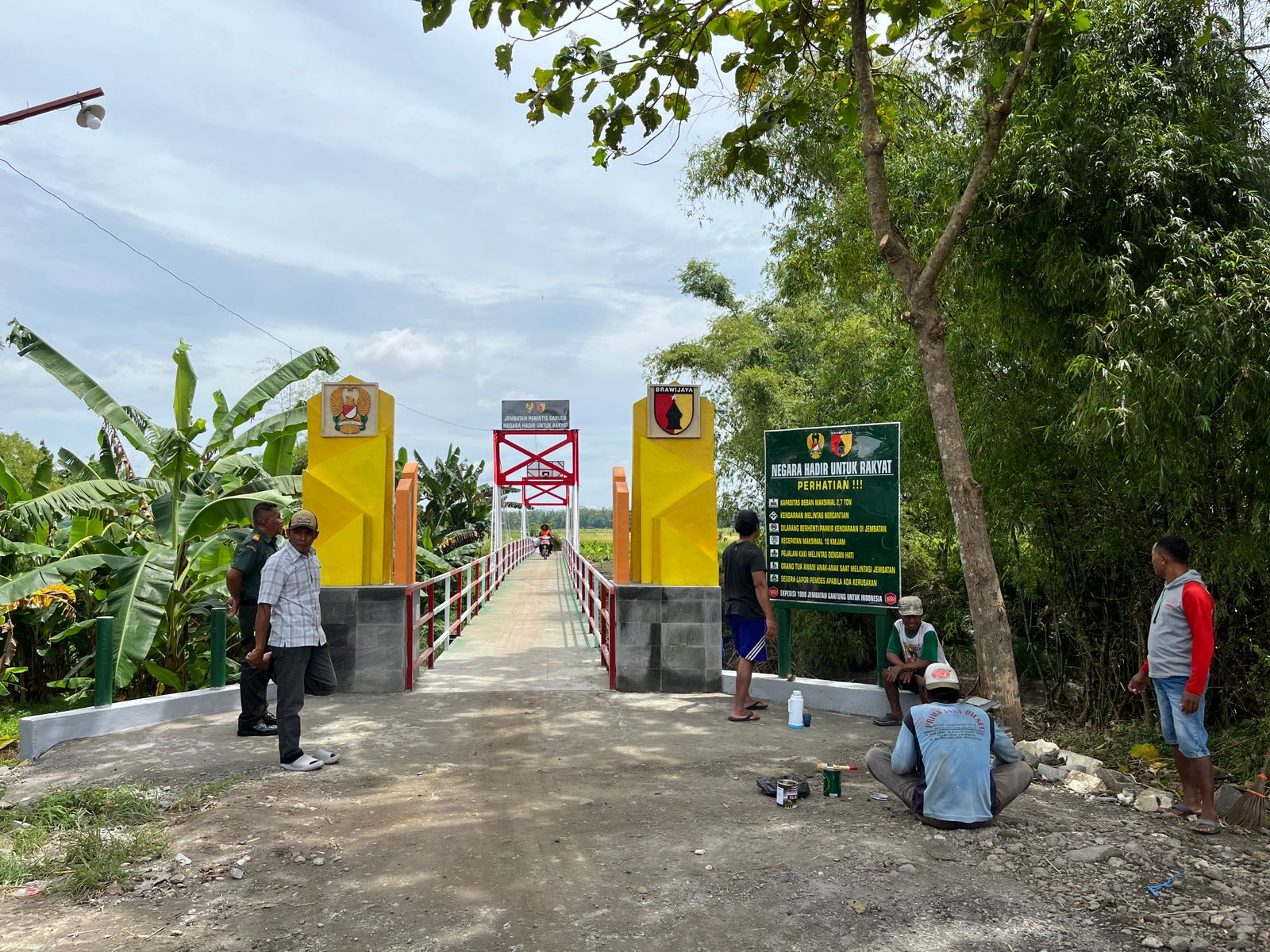 Nganjuk – Usai melaksanakan kerja bhakti membersihkan area Jembatan Perintis Garuda, suasana hangat penuh kebersamaan tampak menghiasi jembatan yang kini telah berdiri kokoh. Warga Desa Bagor Wetan terlihat beristirahat sambil bersenda gurau di atas jembatan, menikmati hasil kerja keras yang telah mereka rawat bersama.
